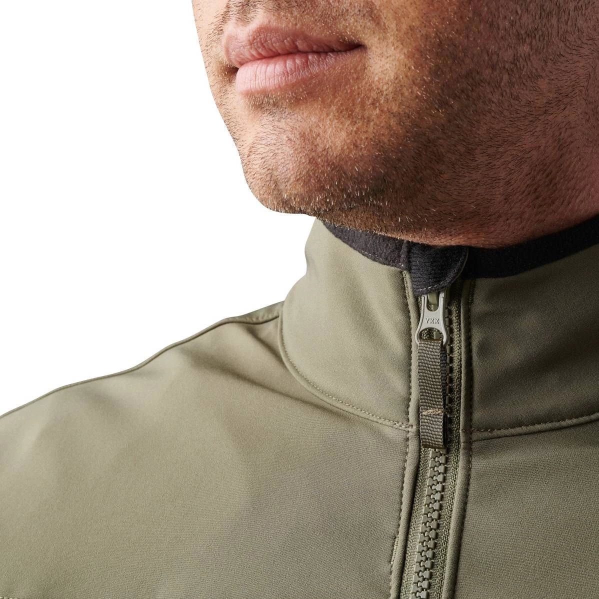 + 100% polyester plain weave face with mechanical stretch, micro fleece backer, softshell 3L, 7.3-oz., DWR