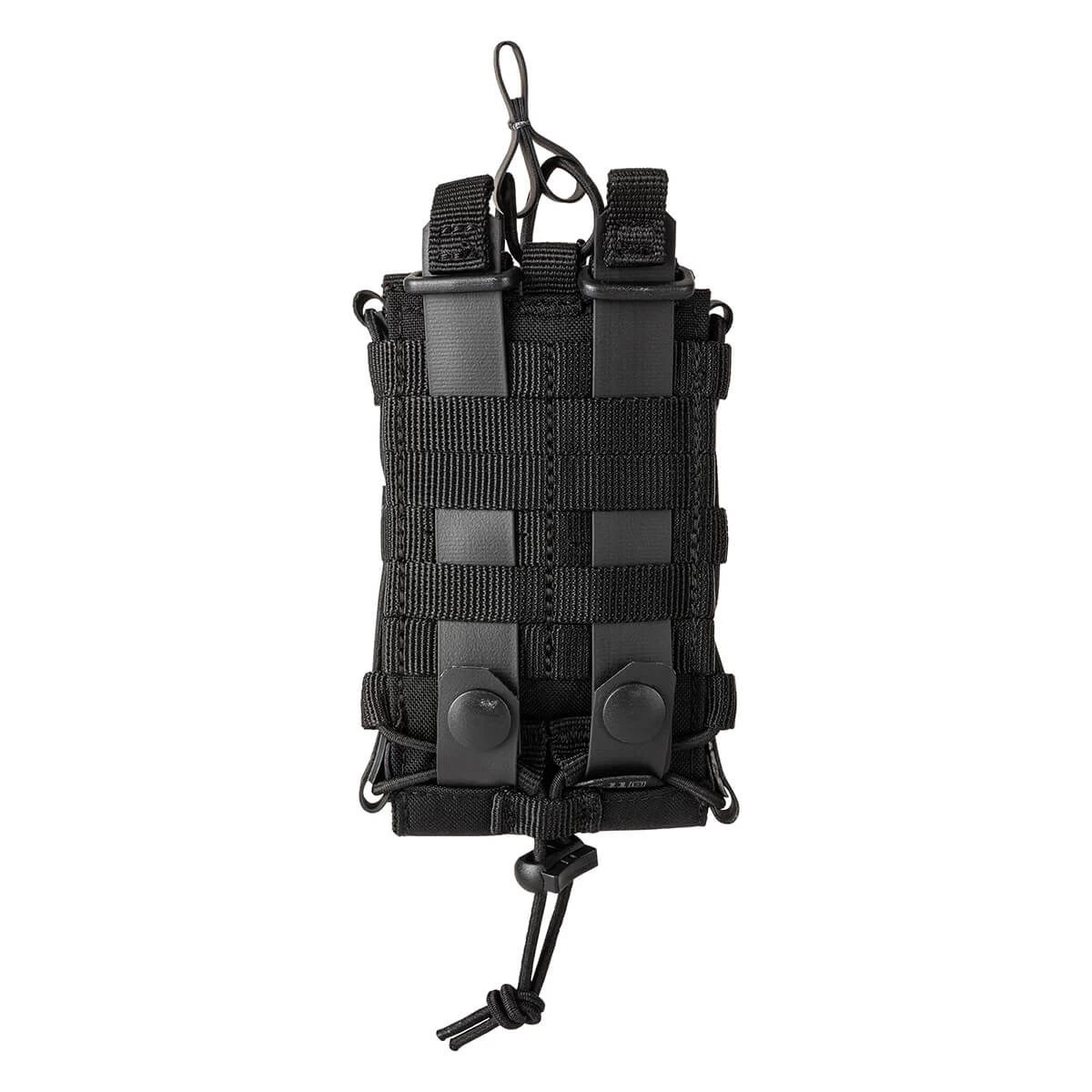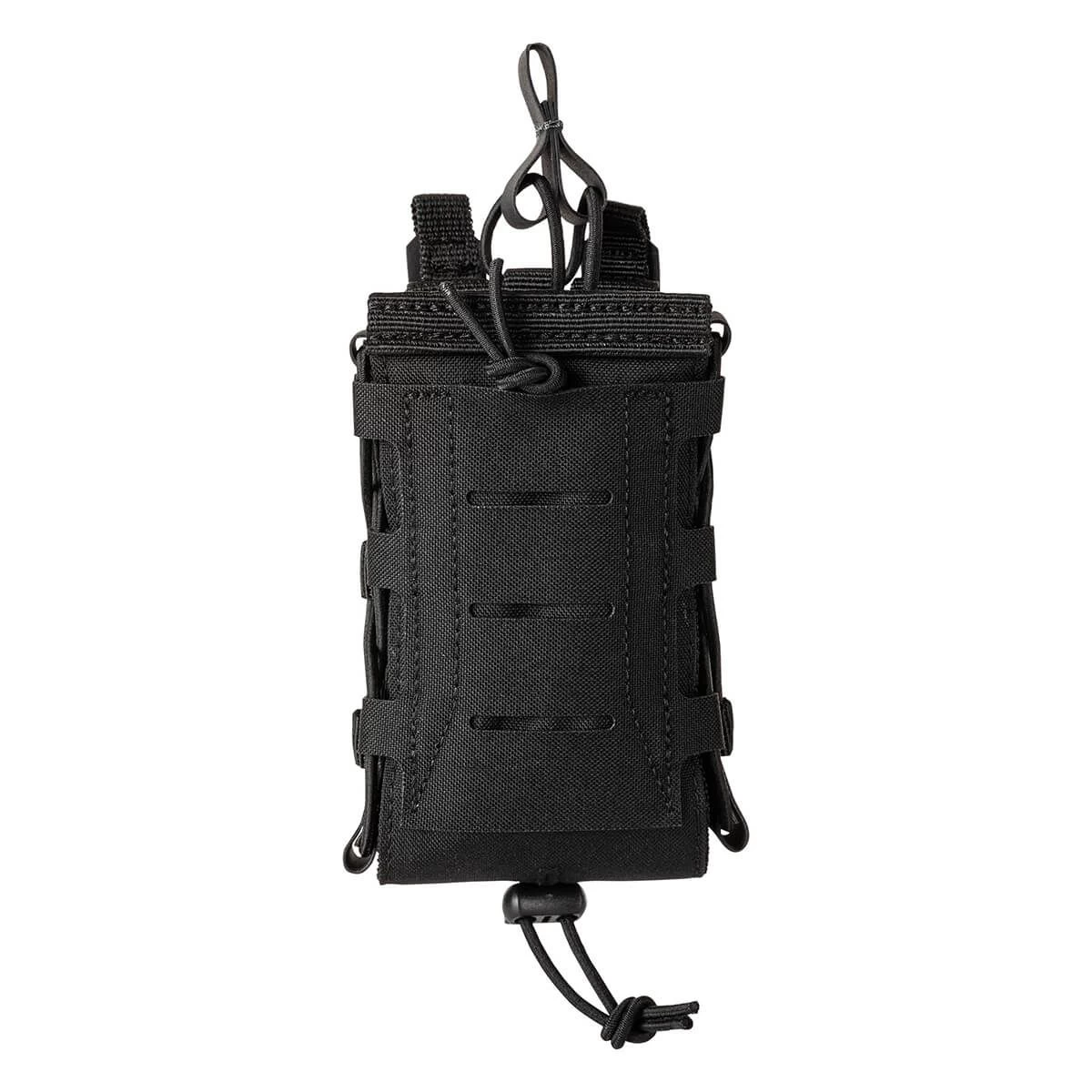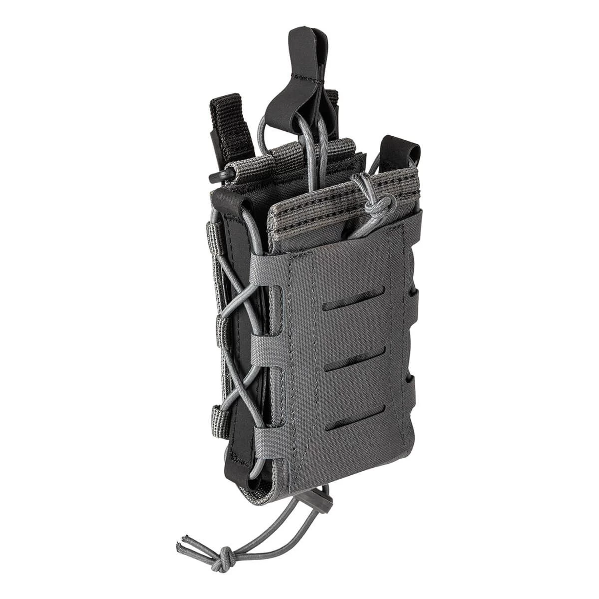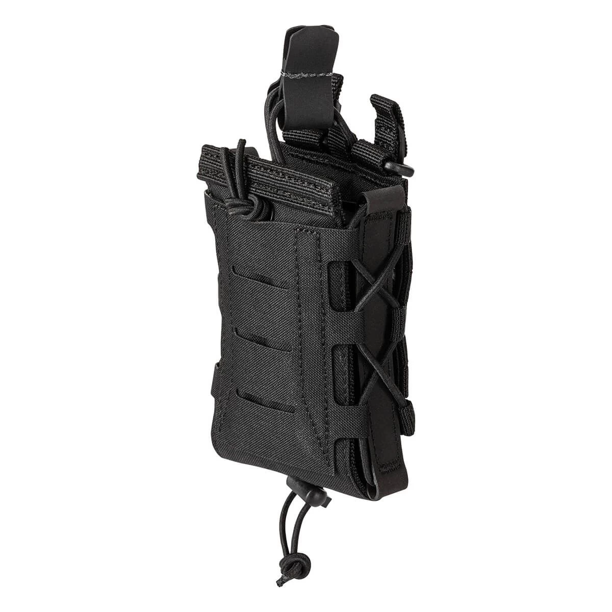 Choose your weapon without worrying how to carry your mags. The 5.11 Flex Single Multi Caliber Mag Cover Pouch has adjustable side panels and a bungee cord with a cord lock system for various mag sizes. The front panel comes with laser-cut MOLLE ready for extra attachments. Flex-HT™ technology provides mounting versatility and easy weaving to all platforms with waterproof TPU coated straps. The front and bottom panels are double layered with 500D for extra durability. An alternate top bungee retention system is included. The drain hole built into the bottom panel adds extra convenience while a reliable Duraflex® G.C. snap gives extra security. No matter your mag size, 5.11 has you covered.