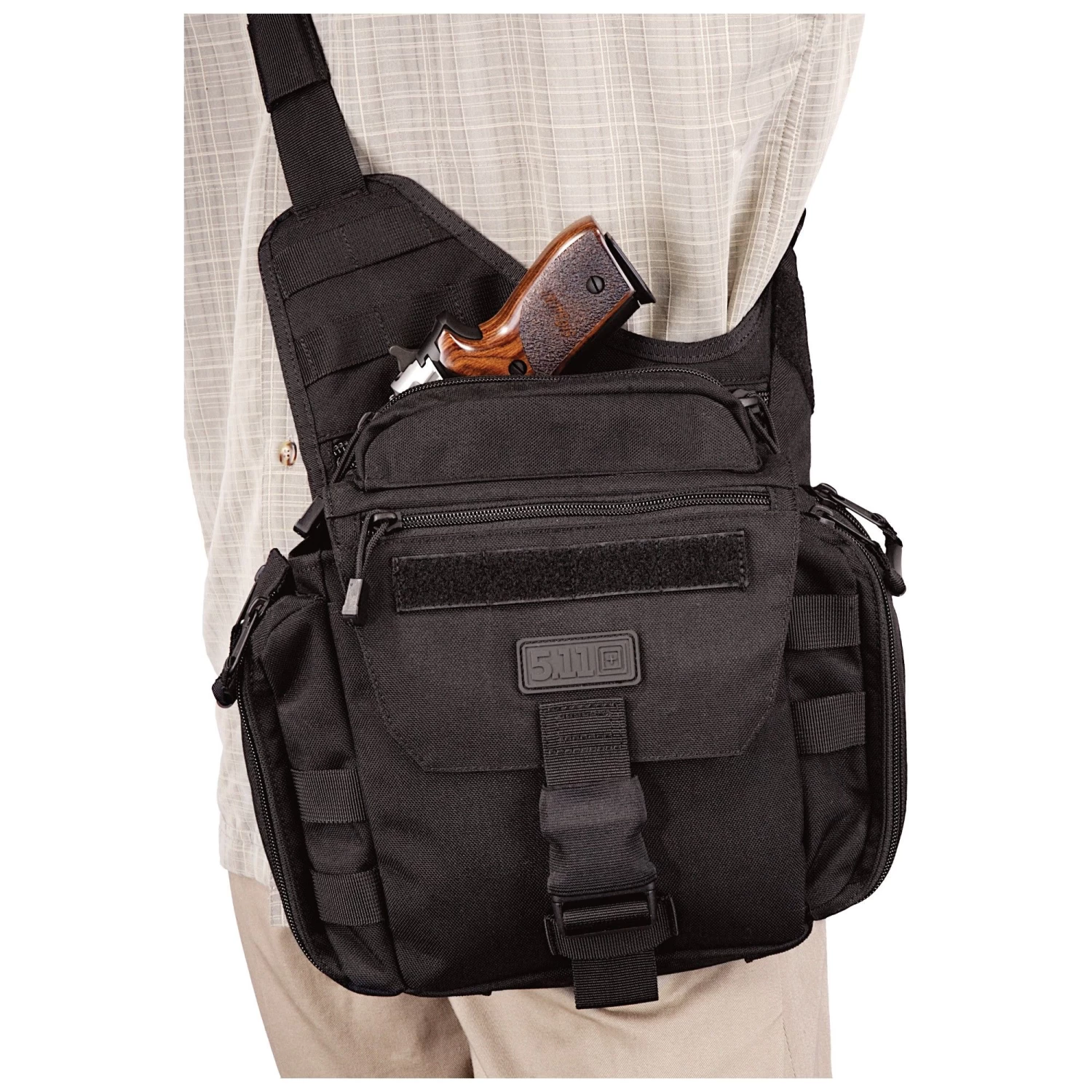Pushâ„¢, short for Practical Utility Shoulder Hold, is built from rugged 1050D nylon and features a large main compartment with two side-expanding pockets. The side pockets are sized to hold one-liter water bottles. A zippered pocket behind the main compartment has loop-sided Velcro to hold Back-Up-Beltâ„¢ System pouches or any other hook sided pouch. An adjustable shoulder strap with removable pad is designed to slip comfortable over your shoulder and is easily adjusted to suit your body type. The bag also features aero-foam padding on the reverse of the Pushâ„¢ to ensure comfortable carry. Keep this bag on the front seat of your squad with all of your emergency gear so that you can exit the vehicle during a critical incident with everything you need.