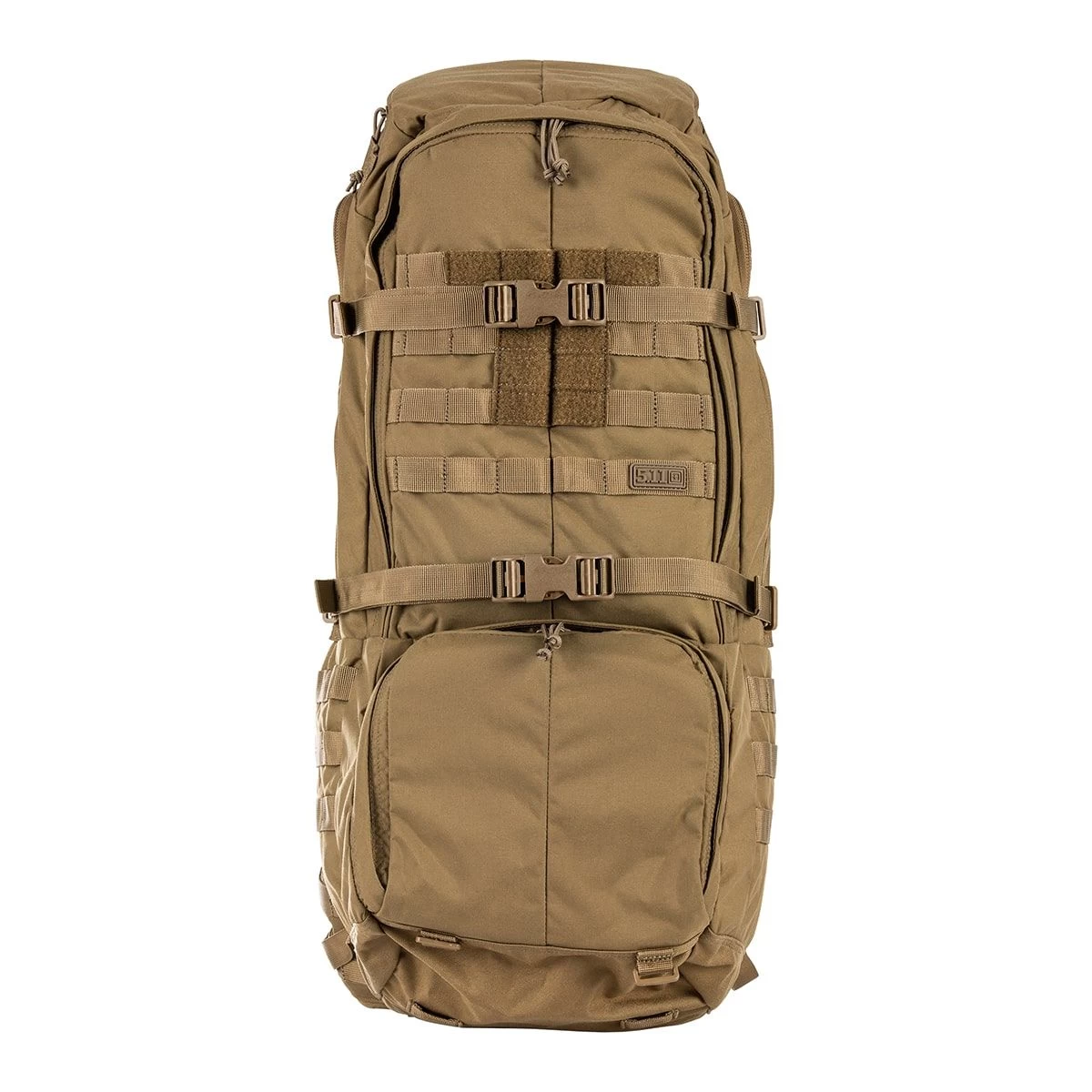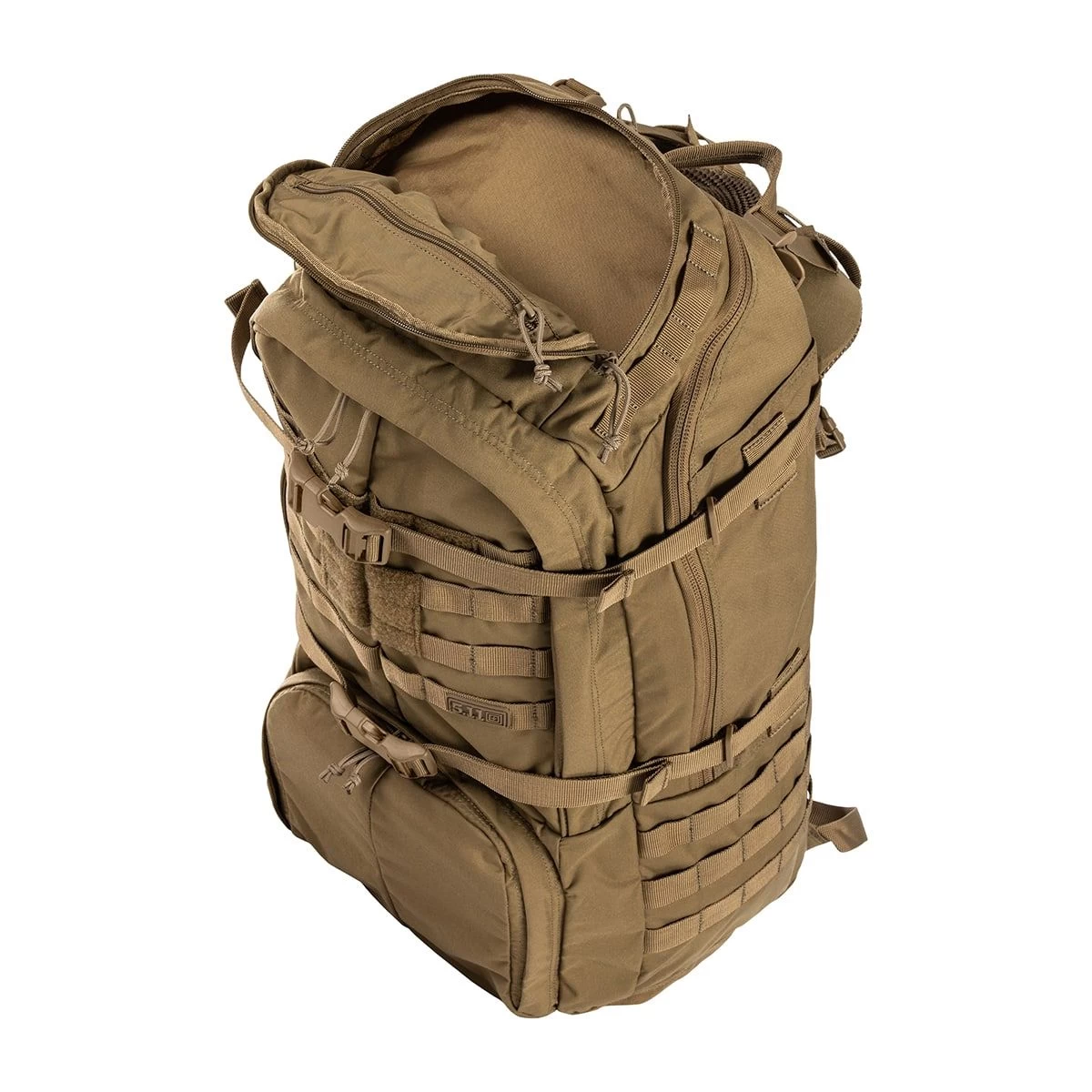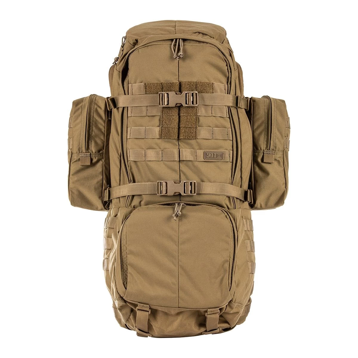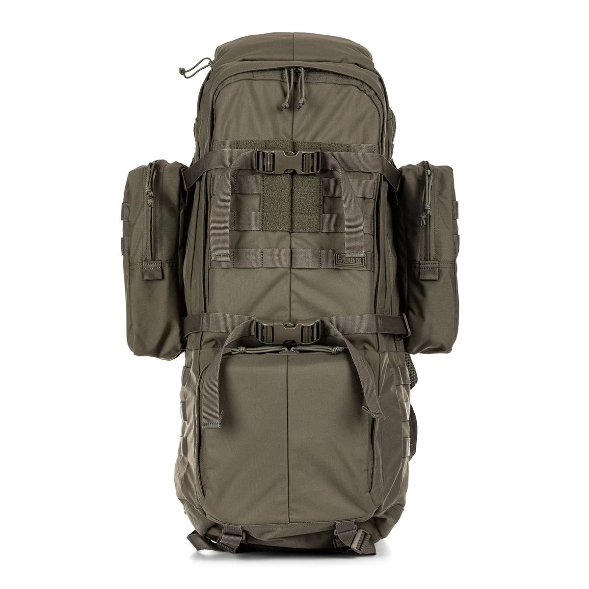 5.11’s first true deployment bag features the kind of versatility men and women in uniform deserve. The heavy-duty construction allows the hydration-compatible RUSH100â„¢ to thrive in hostile environments, yet its modularity is the ideal response to fast-changing situations. Side pouches can be quickly detached and converted to a shoulder bag for effortless gear deployment. A first-grabs pocket keeps readily needed items quickly accessible and includes a fleece-lined eyewear pocket. The adjustable shoulder strap and gear belt in a 60-litre volume system are capable of carrying your heaviest load. Comfort is ensured by a padded, removable load-bearing waist belt, which keeps weight loaded on the hips and your essential survival gear close by. The adjustable shoulder straps with load lifters and a sternum strap keep things aligned on long hauls and dual compression straps with Duraflex® Autolock buckles ensure everything is tight. The custom flat aluminium frame provides rigidity, ergonomics and load transfer while the horizontal fibreglass rods provide torsional rigidity.