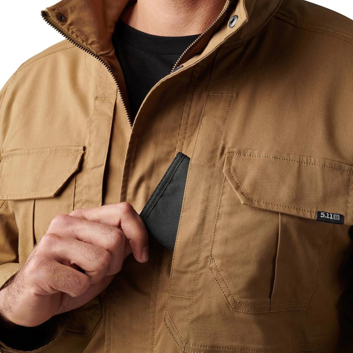 5.11’s engineers took a classic field jacket style and loaded it with modern tactical features. The Watch Jacket is constructed from incredibly durable Flex-Tac® canvas. This jacket’s mechanical stretch and articulated sleeves allow you full range of motion. A Teflonâ„¢ finish repels rain, fluids and stains. The 5.11 Watch Jacket is built to carry. Stash your phone, documents, and EDC accessories in the patented ReadyPocketâ„¢ on both the left and right chest. Two chest patch pockets and two exterior hand pockets keep additional accessories secure with flaps closed by concealed snaps. A two-way zipper offers quick on and off while snap cuffs keep the sleeves in place.