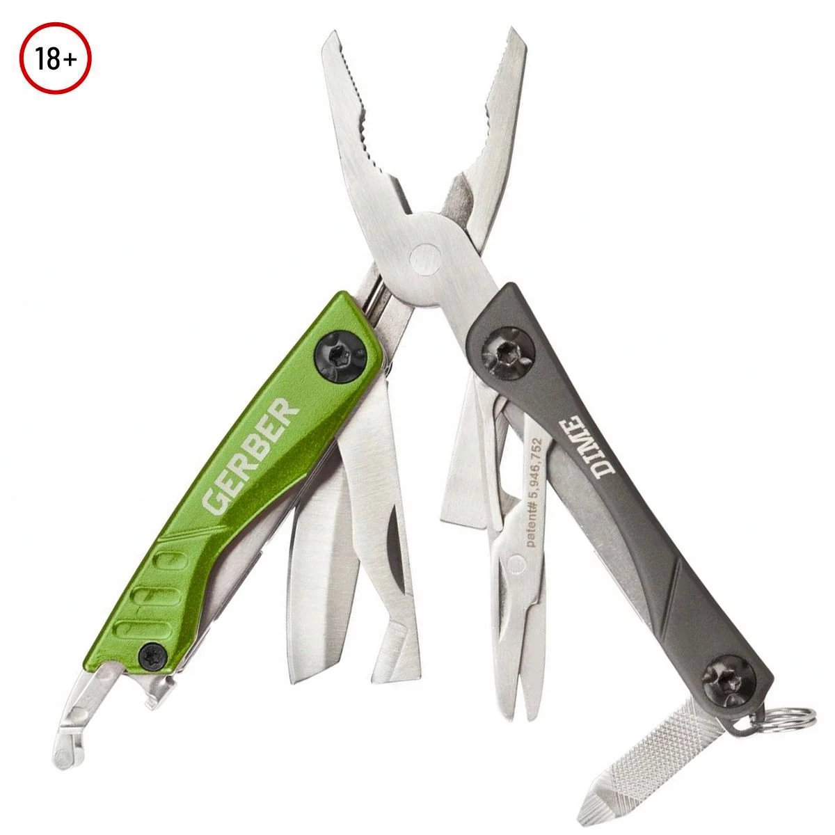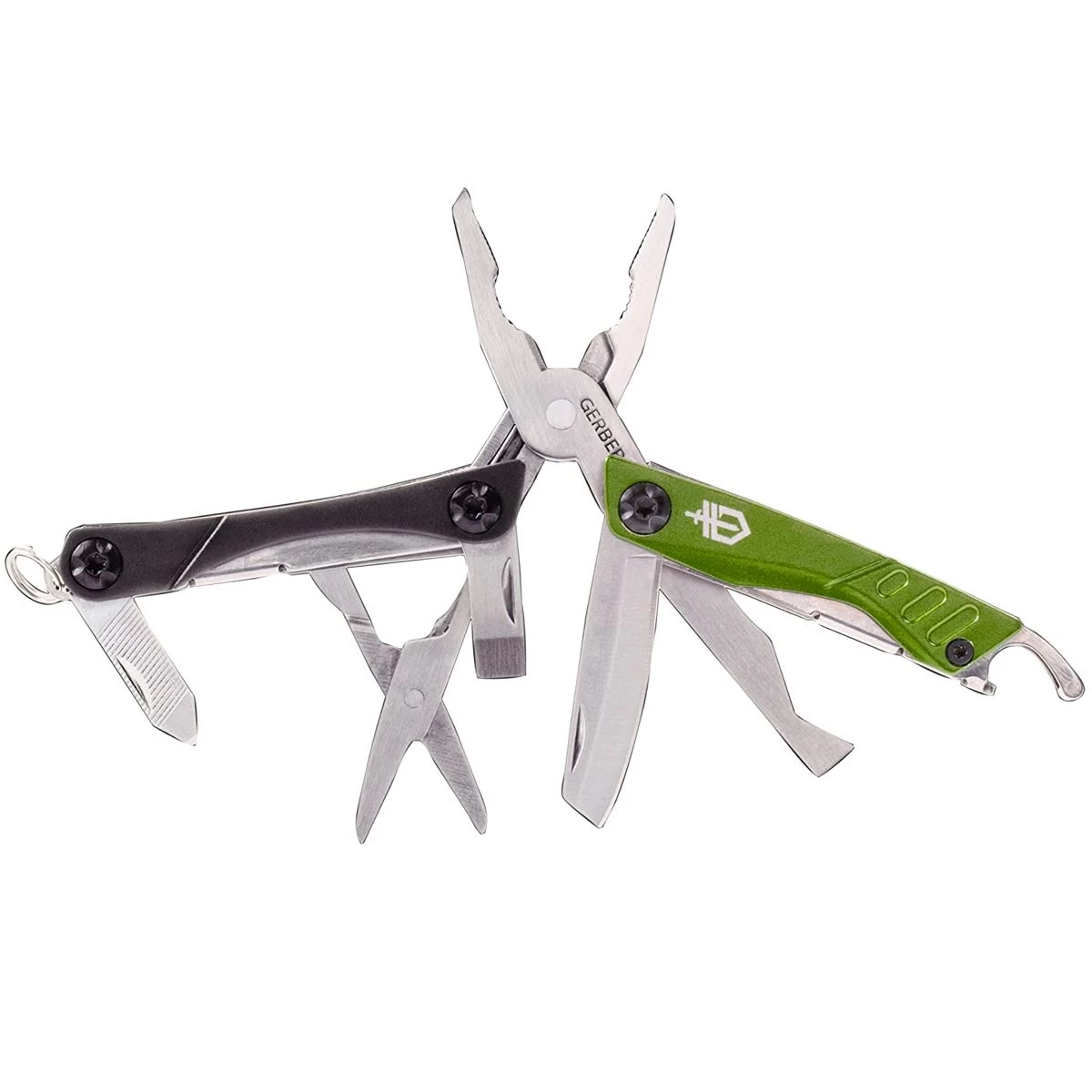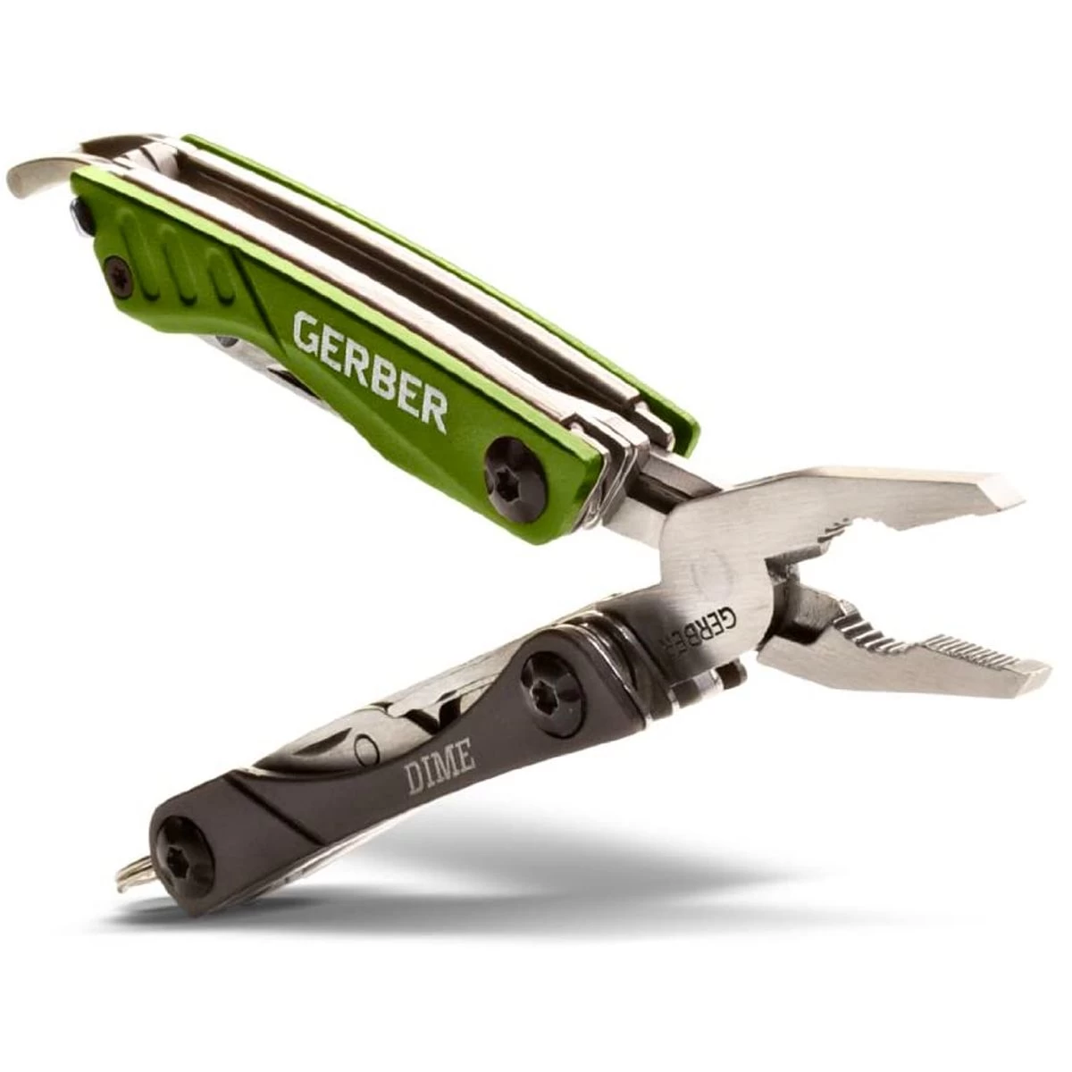 Gerber Dime Mini Multi-Tool in Green has stainless steel pliers, wire cutters, a fine edge blade, spring-loaded scissors, flathead screwdriver, crosshead driver, tweezers and file. The Gerber Dime Mini Multi-Tool includes a unique blade designed to safely cut and score plastic packaging and a bottle opener that is exposed even when the tool is closed. Compact and lightweight, the Gerber Dime Mini Multi-Tool is the most valuable change you’ll find in your pocket.