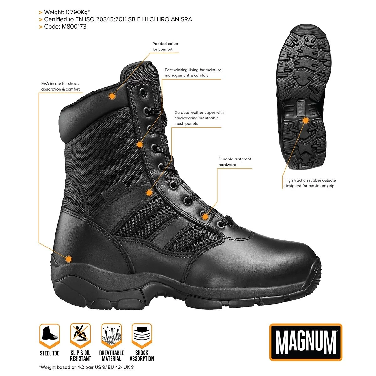 The Magnum Panther 8.0 Steel Toe Boots feature a durable leather upper and hard-wearing breathable mesh panels. These safety boots have a steel toe-cap for added protection from falling objects. A fast wicking lining adds moisture management to keep boots fresher for longer while further durability is added with the strong rustproof hardware.