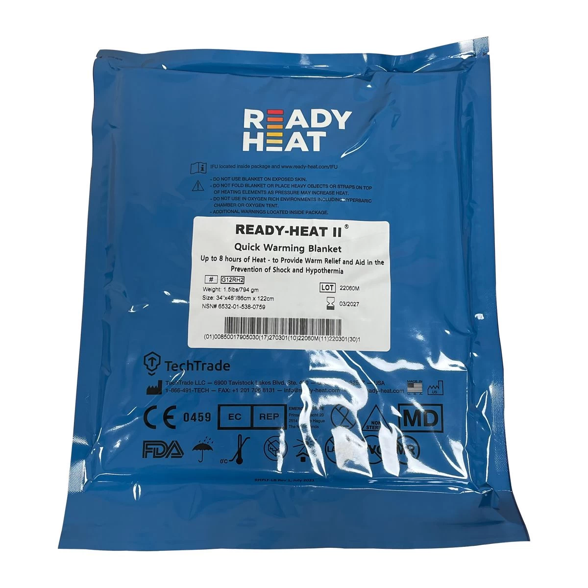 The heat that will be generated will provide sufficient warmth and comfort to the user for several hours. All Ready-Heat™ blankets are water repellent and provide UV protection Aids in the prevention of Hypothermia in trauma patients Ready-Heat™ offers a convenient, ready to use blanket that remains warm to 104° Fahrenheit (40° C) for approximately 6-8 hours Warms to 104ºF within 15-20 minutes once opened Maintains temperature for up to 8 hours Designed to carry a person up to 113kg
